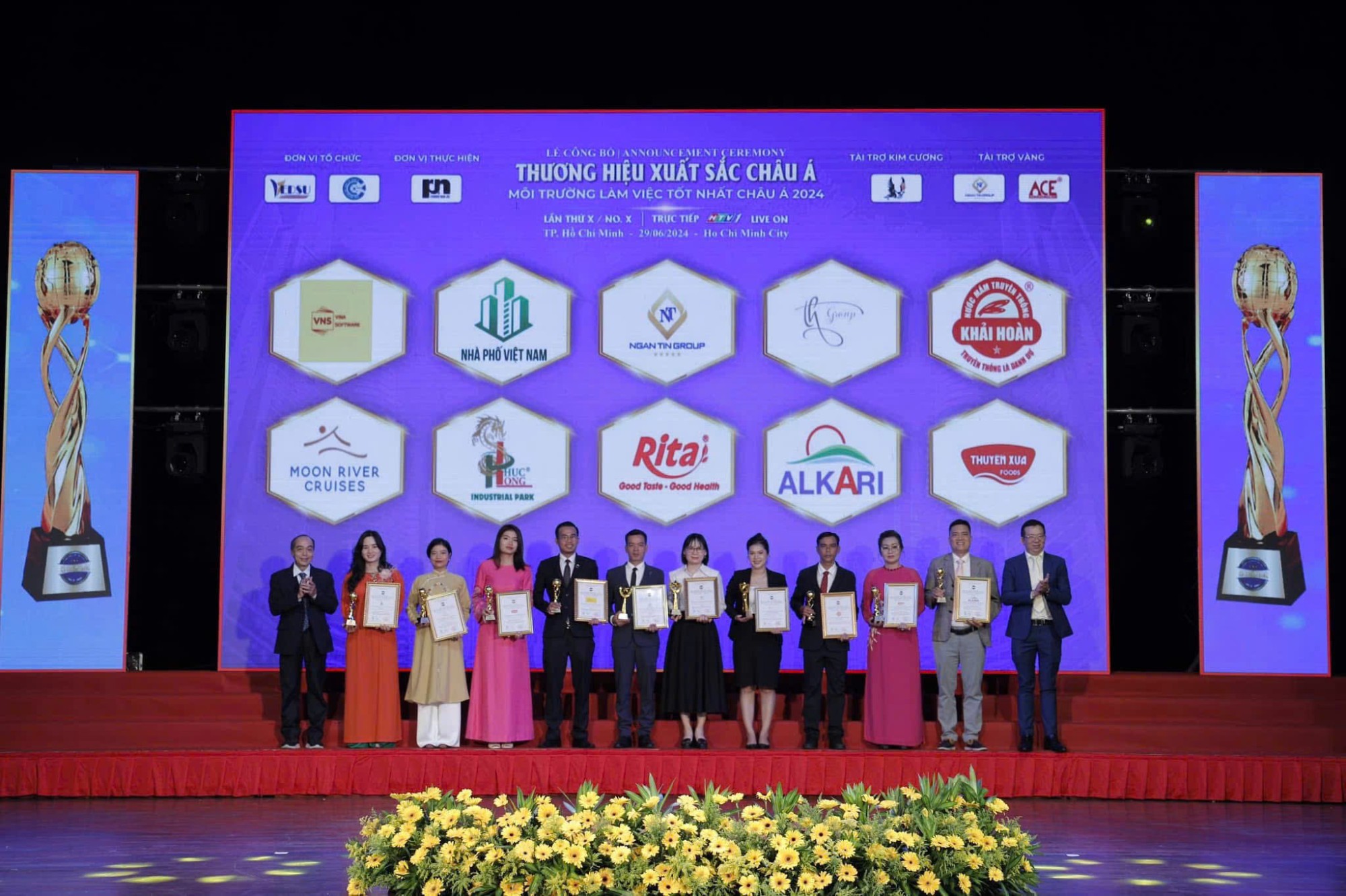 Phó Giám đốc Công ty TNHH Đầu tư và Xây dựng Phúc Long - Bà Phạm Xuân Hiền (giữa), nhận chứng nhận “Thương hiệu xuất sắc châu Á 2024”