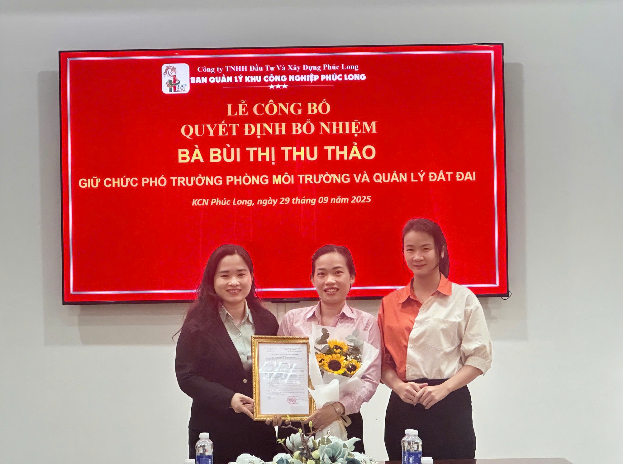 Phó Giám đốc Công ty TNHH Đầu tư và Xây dựng Phúc Long - Bà Phạm Xuân Hiền (trái), cùng Phó Giám đốc kinh doanh Công ty TNHH Đầu tư và Xây dựng Phúc Long - Bà Huỳnh Thị Hồng Nhạn (phải) trao quyết định bổ nhiệm "Phó trưởng phòng Môi trường và Quản lý đất đai" cho Bà - Bùi Thị Thu Thảo (giữa).