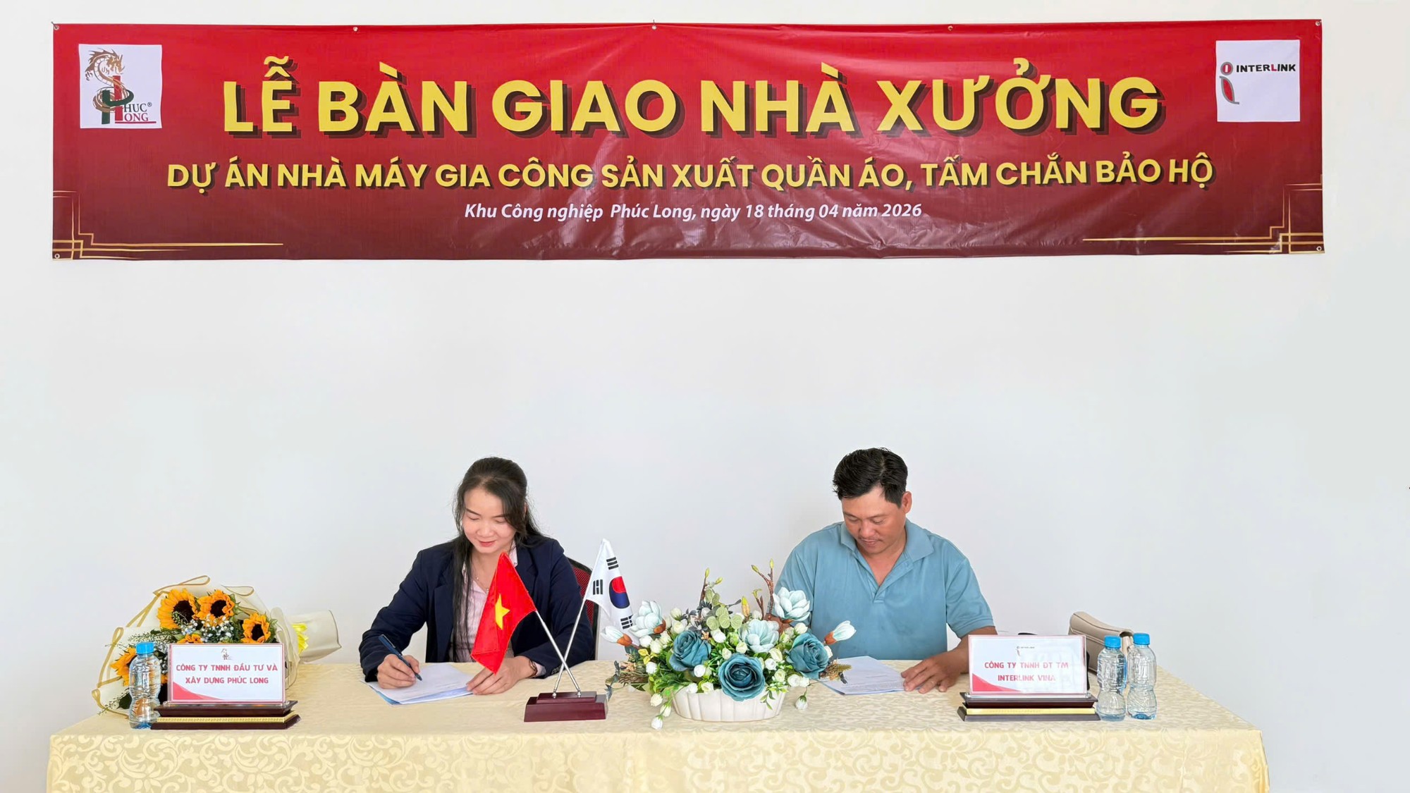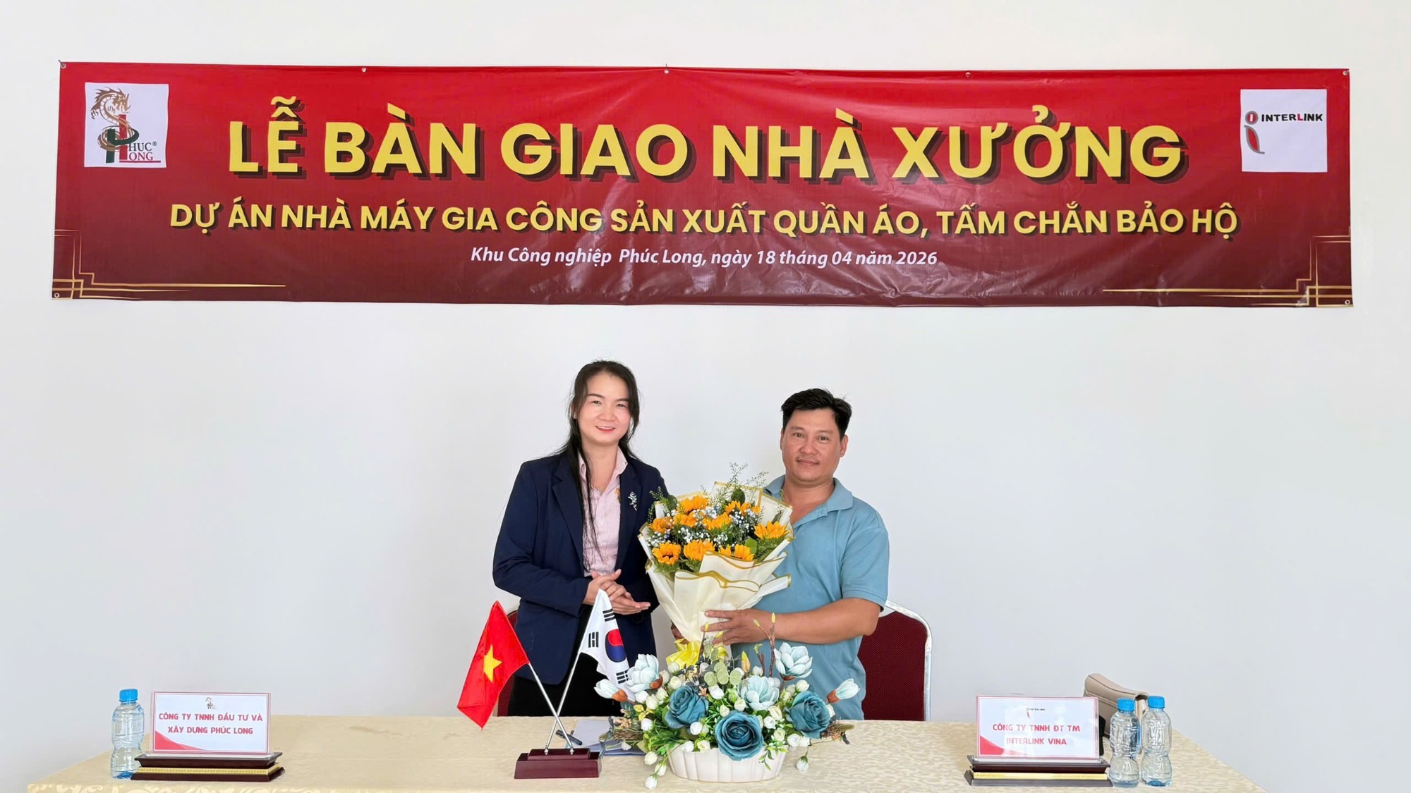Hôm nay ngày 18 tháng 04 năm 2026, Ban quản lý KCN Phúc Long đã tổ chức buổi lễ bàn giao nhà xưởng cho Công ty TNHH Đầu tư Thương mại Interlink Vina, dự án “Nhà máy gia công sản xuất quần áo, tấm chắn bảo hộ”. Với quy mô nhà xưởng hơn 4000m2, đây sẽ là một dự án đầy tiềm năng và phát triển.