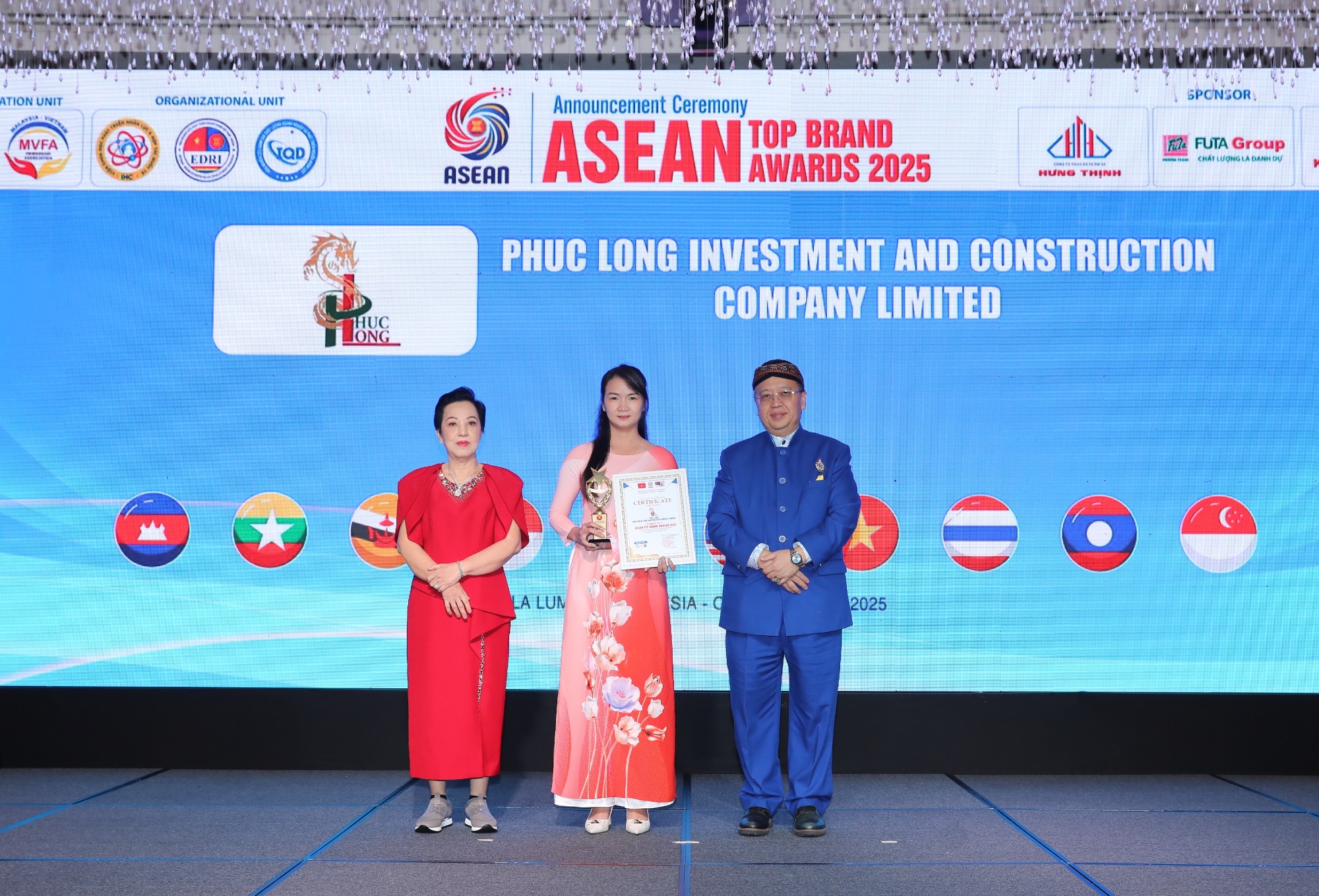 Phó giám đốc kinh doanh của Công ty TNHH Đầu Tư và Xây Dựng Phúc Long - Bà Huỳnh Thị Hồng Nhạn (giữa), nhận giải “Thương hiệu uy tín hàng đầu Asean 2025”